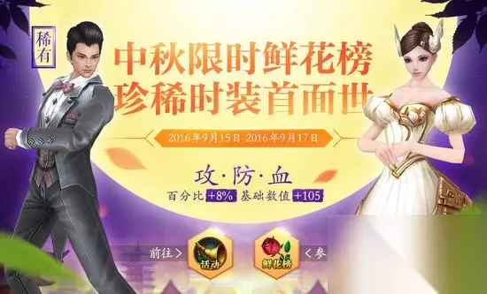 【中秋鲜花榜活动】 活动内容:活动期间内,本服鲜花榜排名与收花积分需达到一定要求即可获得相应奖励。榜单结算时间为9月17日。 奖励:本服务器内鲜花榜达世界第1且达到1314收花积分的玩家可获得第一档奖励:流光时装;本服务器内鲜花榜达世界前5且达到999收花积分的玩家可获得第二档奖励:瑞彩时装;本服务器内鲜花榜达世界前10且达到520收花积分的玩家可获得第三档奖励:婷婀时装。