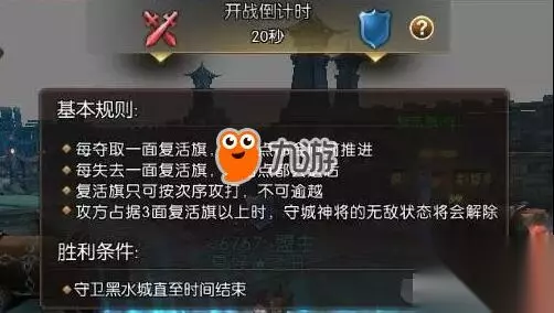 城战战斗规则 本次仅开放黑水城战,黑水城战规则如下: (1) 黑水城战持续20分钟,城战结束时,成为防守方的血盟获得胜利 (2)黑水城内有4面复活旗,占领复活旗之后,即可在附近区域复活 (3)成功击杀护城神兽,即可进行攻防转换。