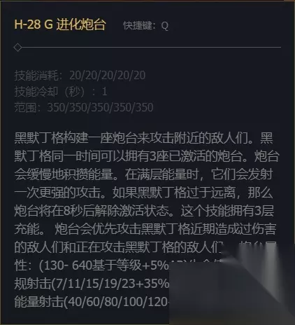 技能介绍 1、黑默丁格,即大发明家,的技能优先级是首要Q技能,其次是W技能。Q技能允许他部署一座炮台,这座炮台会自动对敌人进行攻击,而且他最多可以同时设置三座这样的炮台。