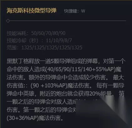 2、W技能是以X字形释放一道弹幕,对命中的敌人造成魔法伤害,如果附近有炮台,炮台还能获得能量。