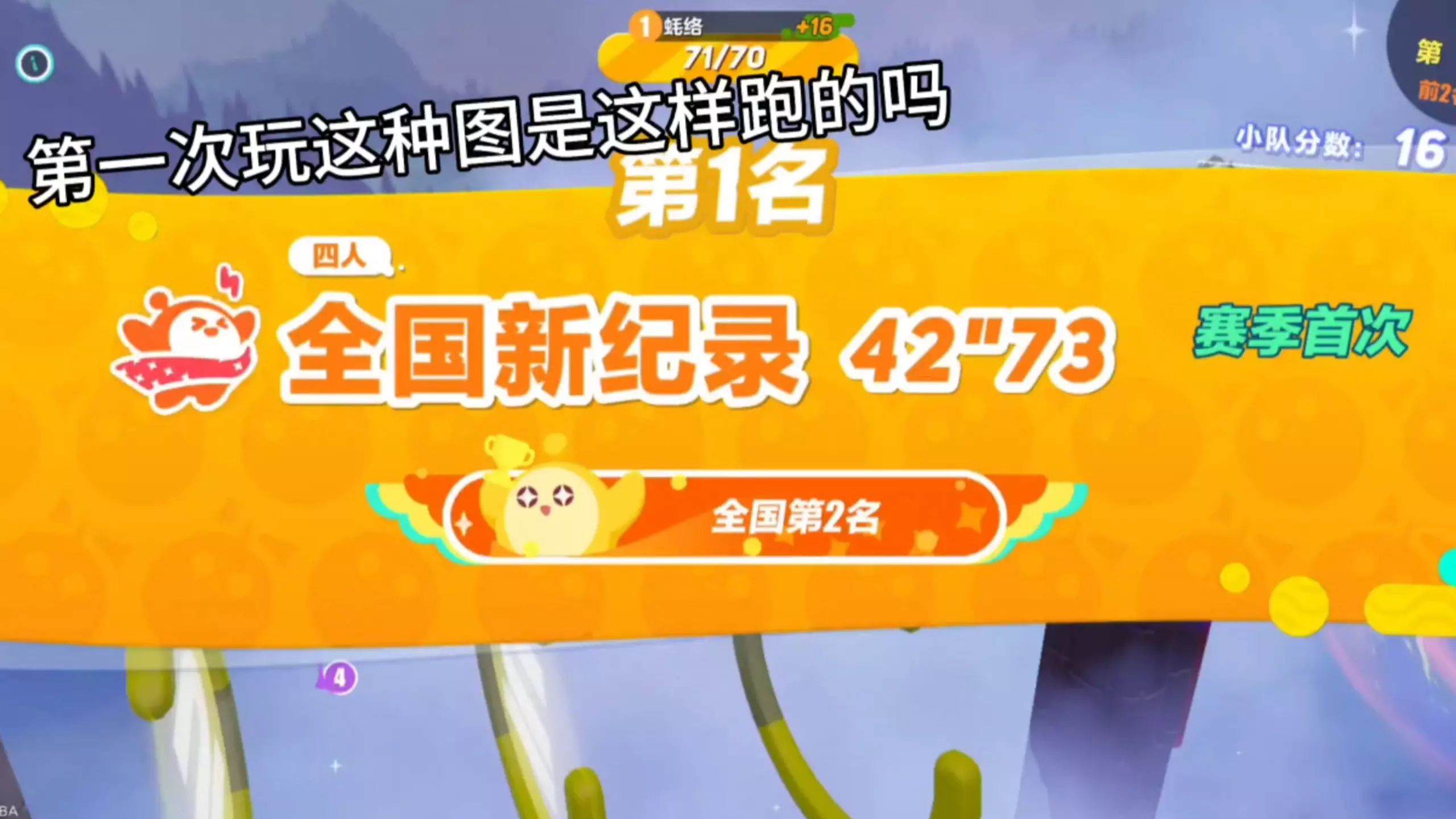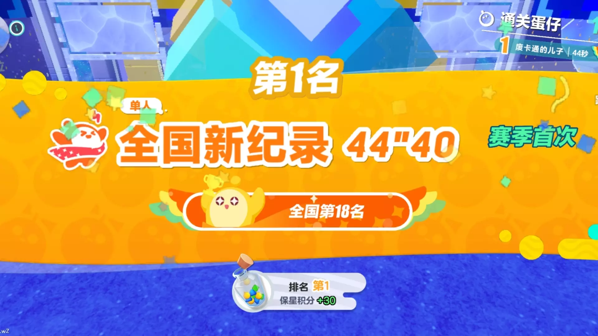 这是《蛋仔派对》的投稿内容,展示了玩家操控蛋仔在不同关卡地图中闯关,利用弹簧绳等道具,最终以32"53的成绩创下全国新纪录,拿下第一名,获得保星积分+30。
