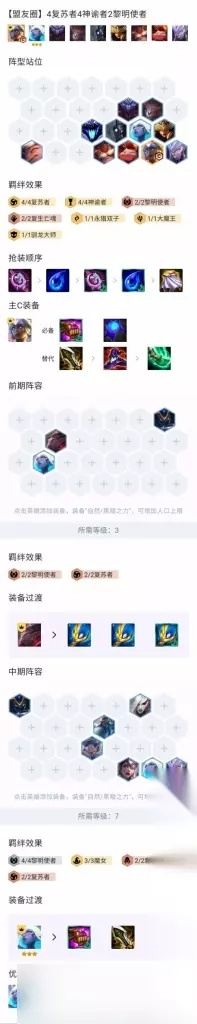 第二种情况就是吸血鬼三星,补复苏魔女就行,这版本吸血鬼加强又多了个六复苏,一个专职就可以实现,这是官方**裸的暗示玩吸血鬼啊,以前吸血鬼都是前期凑四复苏后面换大头的,也确实,我在这个版本回归狂暴后就看到人人都在赌,所以吸血鬼大概率是三不了,但是我们也没指望它三,当狼人追不了三,我们就可以取出大天使给吸血鬼,基本后面大家也会转型吸血鬼前面难拿后面也挺容易的,有四张就给吸血鬼带大天使,奶妈二星了魔女给到奶妈,我们装备6级时肯定都是尽量拿的ap装,直接奶妈主c,法爆无尽蓝buff,轻松赢到7级,不行奶妈也可以带大天使,老规矩是准备4张奶妈,能追三肯定就奶妈主c,不能留准备第三次转型,7级找卡尔玛和小菊。 这里提一嘴,7级前大家基本报团站,奶妈收益很高,7级后大家都会分散一下,奶妈没多少容错,还得卡尔玛不用考虑对手站位,卡尔玛还是一件蓝装两件法爆装,大天使这时候可以给到小菊,这套阵容为什么丝滑,因为这装备太好用了,如果来了提莫大头也可以带到ap装,在神谕和复苏中凑出四加二甚至四加四就行,血量大优你咋打都行,卡尔玛最好凑个四黎明,常规阵容是补上狗熊,后期大头或者提莫二星还可以继续进行第四次第五次转型,小菊卡尔玛装备继续交替,谁吃魔女谁主c,这套阵容里唯一不用换的就是魔女,加上这版本武器库和装备拆卸重铸的出现,我只能用丝滑来形容这套阵容。