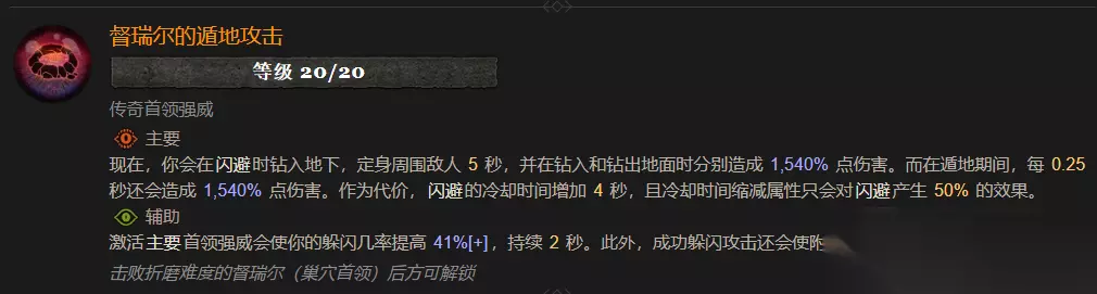 暗黑4S8赛季会新增首领强威,可以从各种BOSS身上获得威能,比如督瑞尔的遁地攻击,那么暗黑4督瑞尔的遁地攻击属性效果是什么?下面就给大家带来暗黑4督瑞尔的遁地攻击属性效果一览。 暗黑4督瑞尔的遁地攻击属性效果一览 督瑞尔的遁地攻击 等级 20/20 传奇首领强威 主要 现在,你会在闪避时钻入地下,定身周围敌人 5 秒,并在钻入和钻出地面时分别造成 1,540% 点伤害。而在遁地期间,每 0.25 秒还会造成 1,540% 点伤害。作为代价,闪避的冷却时间增加 4 秒,且冷却时间缩减属性只会对闪避产生 50% 的效果。 辅助 激活主要首领强威会使你的躲闪几率提高 41%[+],持续 2 秒。此外,成功躲闪攻击还会使附近的敌人定身 3 秒。 击败折磨难度的督瑞尔(巢穴首领)后方可解锁
