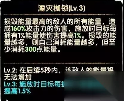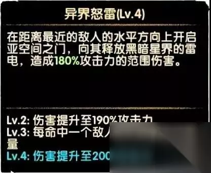 二技能异界怒雷,在最近敌人水平方向开启一道门放出闪电,攻击同一水平线敌人。,每命中一个敌人额外恢复50能量,四技能被动满1000能量后会在最远处敌人也开启一道门。 当最远处敌人与最近处敌人在同一水平线,也就是说两道闪电范围重合的时候,只会造成一次伤害同时每次释放这个技能的时候身上有个+50能量的符号。