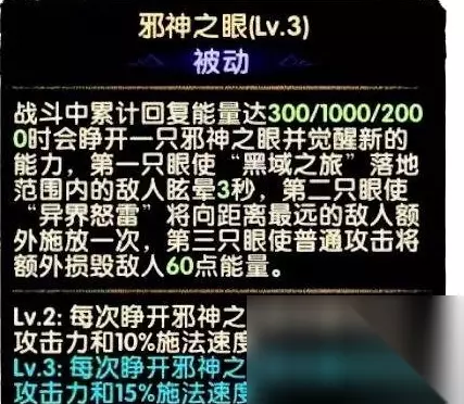 四技能是被动,被动-邪神之眼战斗中累计回复能量达300/1000/2000时各会睁开一只眼睛并觉醒新能量。第一次时黑域之旅落地范围内敌人眩晕3秒,第二次时异界怒雷将向最远敌人额外释放一次,第三次时普工攻击削减敌人60能量,并且每次睁眼提供15%攻击力和释放速度。