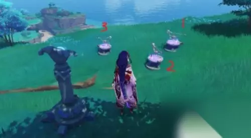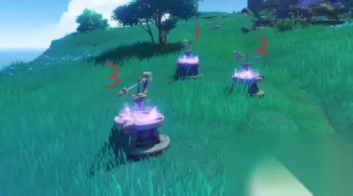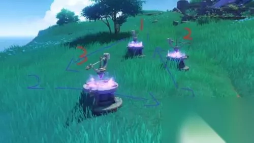 3.因此我们需要在初始雷灵抵达3号探针左侧(蓝色笔迹2号位置)时放出第二只雷灵,并控制角色站在第二只雷灵前沾染雷元素(即站在3号探针的正确位置)随后两只雷灵会先后移动至1、2号探针。3号探针前因为有沾染雷元素的人物所以始终保持正确的方向,解密完成。