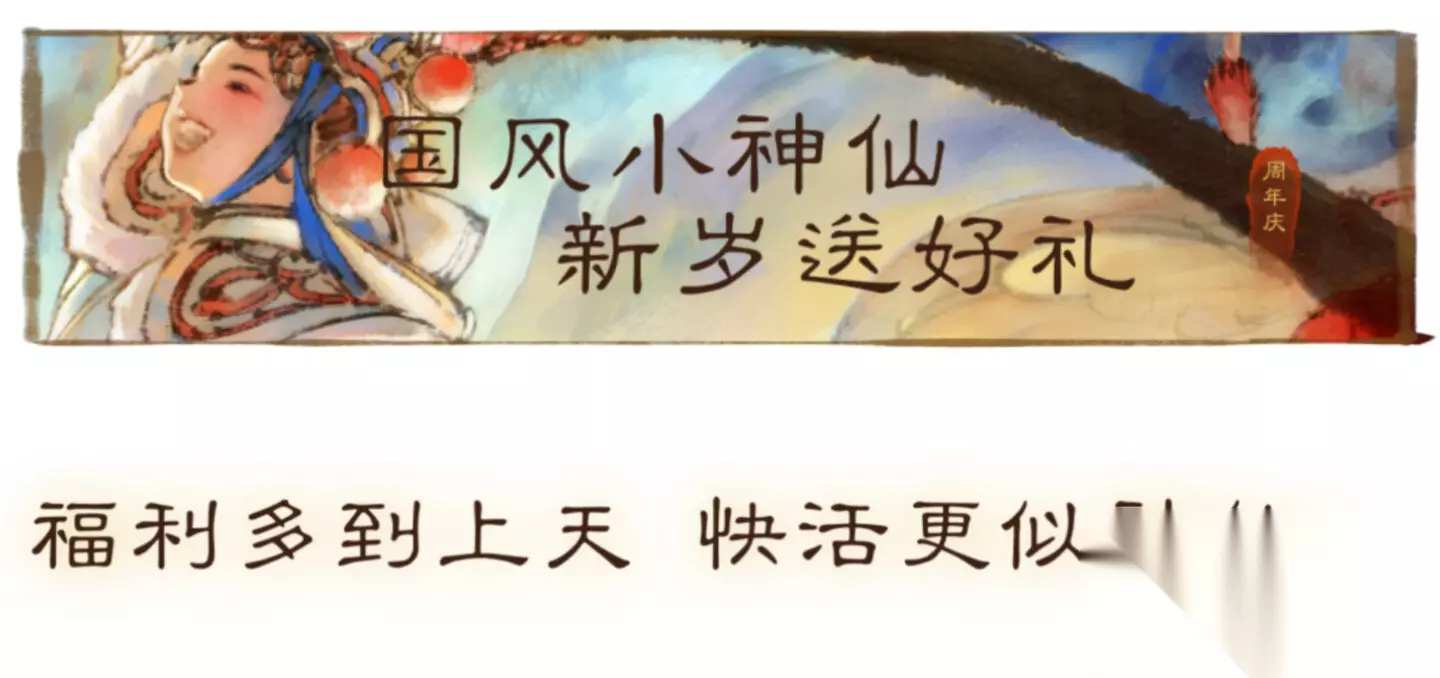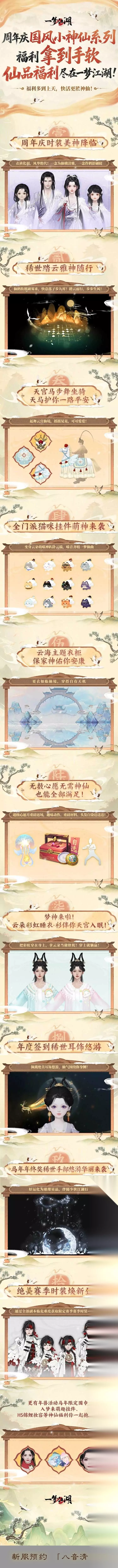 八载江湖梦,幸有君同行。为答谢少侠们八年来的一路相伴,周年庆国风小神仙系列福利来袭,铺开一场“仙气十足”、又别具古风韵味的新年盛宴。绝美羽衣时装、稀世仙鹤踏云、天宫马步舞坐骑、门派小梦神挂件、全新天宫衣柜、萌趣云朵睡衣等全套小神仙外观,以及赛季福利、年度签到仙气耳饰、年度绝美手部悠游、马年限定围巾、入梦来萌趣挂件、H5锦鲤妆容等神仙福利,愿这份精心备下、拿到手软的仙品好礼,陪伴少侠云游天宫奇景,共迎祥瑞新春!