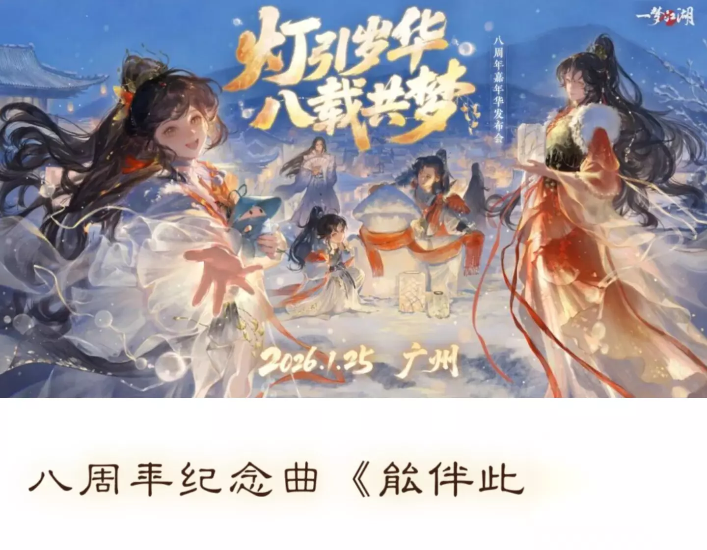 八载岁月,一梦同舟。2026年1月25日,一梦江湖八周年嘉年华将落地广东广州,与你在线下相逢回顾来时路,展望第八年的新旅途——江湖如长夜,你我原是散落四方的萤光,因缘相逢,以情为焰,终聚作温暖灯海;天地亦如雪,苍茫寒暖皆是岁月,正是这共行风雪中的步履,将凛冽淬成相守的温热。 灯引岁华,八载共梦,让我们在灯火下重逢—— 赴风雪之约,徜徉灯火之间,再梦江湖成长共鸣事; 见鱼跃四海,共游山河盛景,同启江湖锦绣新一程! 嘉年华具体地址将于近日正式公布。灯已燃,雪正纷,此夕宜相逢——1月25日,广州见!