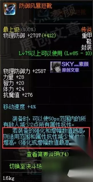 防御风暴短靴:减抗的范围和数值可随强化等级提升,强化+10时可使550px范围内的敌人减少22点全属性抗性。减抗效果非常优秀的一件装备,搭配天劫套的四个部位,可实现全属抗减少66点的效果。