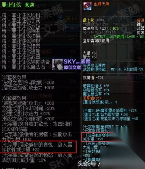 七宗罪的Buff换装方式,是在异界二期套装罪业征伐[6]的基础上,使用增加等级的装备将[七宗罪]提升至20级。武器的最佳选择为[血葬天痕],可使七宗罪的减抗数值增加15%;如果纯粹是为了混团,对换装没有那么高的要求,换装武器也可以用传承或者复苏泰拉作为代替(效果自然没有血葬好)。20级七宗罪的减抗数值为130点,在算上罪业征伐[6]的22点以及血葬天痕的15%之后,减抗数值可上升至174.8点。 [Buff换装之外的装备搭配] 在进行七宗罪Buff换装之后,我们还可以通过穿戴其他的减抗装备来进一步提高断罪者的减抗能力,其中也包括少数对[罪业诱惑]具有增益效果的装备。