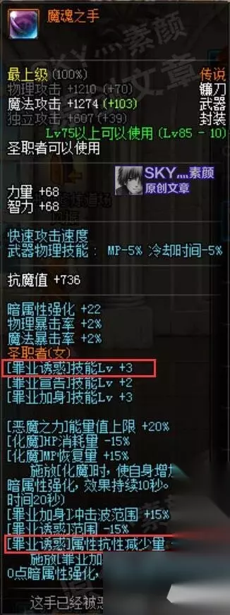 魔魂之手:[罪业诱惑]等级+3,属性抗性减少量+10点。[罪业诱惑]的等级每提升一级,大约可增加2点减抗数值,魔魂之手在计入等级提升和额外提升之后,可使[罪业诱惑]的减抗数值大约提升16点。但就辅助队友而言,魔魂之手并不是最佳选择,无轩黄金念珠的全队面板,禁灭之锤的减防效果,为队友带来的提升都比这16点减抗高。
