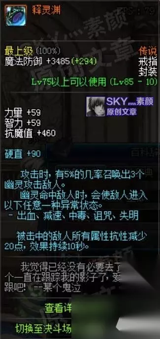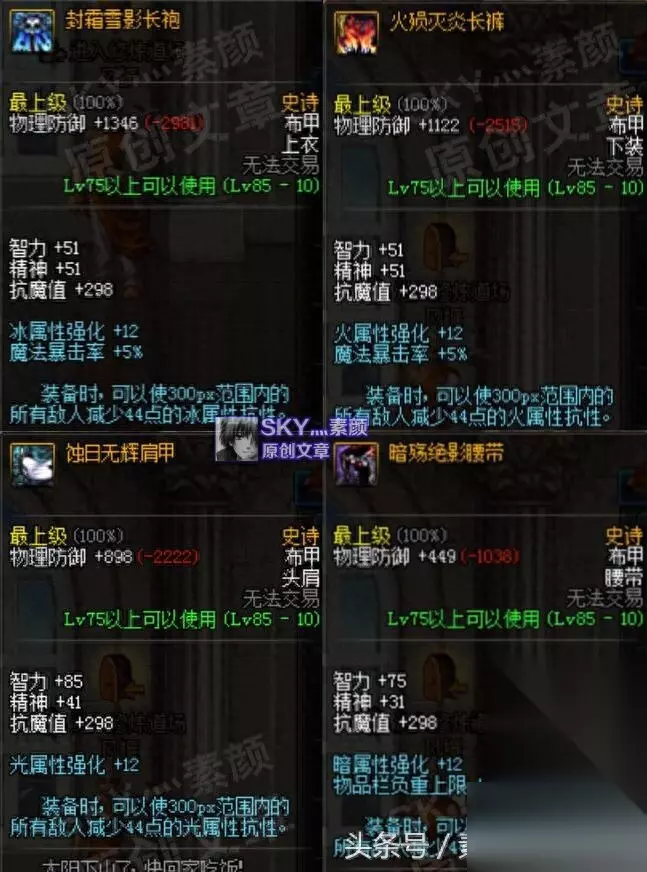 尘封的悲鸣套装:[5]套装可使300px范围内的敌人减少25点全属抗,[6]套装则在[5]套装的基础上再增加10点减抗数值。悲鸣套算是天劫四个部位的低配版,也可以与天劫的单件配合使用。并且在防具是天劫四+防御风暴短靴的情况下,右边三件首饰+两个特殊装备正好可以凑齐悲鸣[5]的效果,天劫四+防御风暴短靴+右边悲鸣[5]总共可减少91点全属抗,是在有一定深渊基础下,比较省事的成型减抗兵搭配。