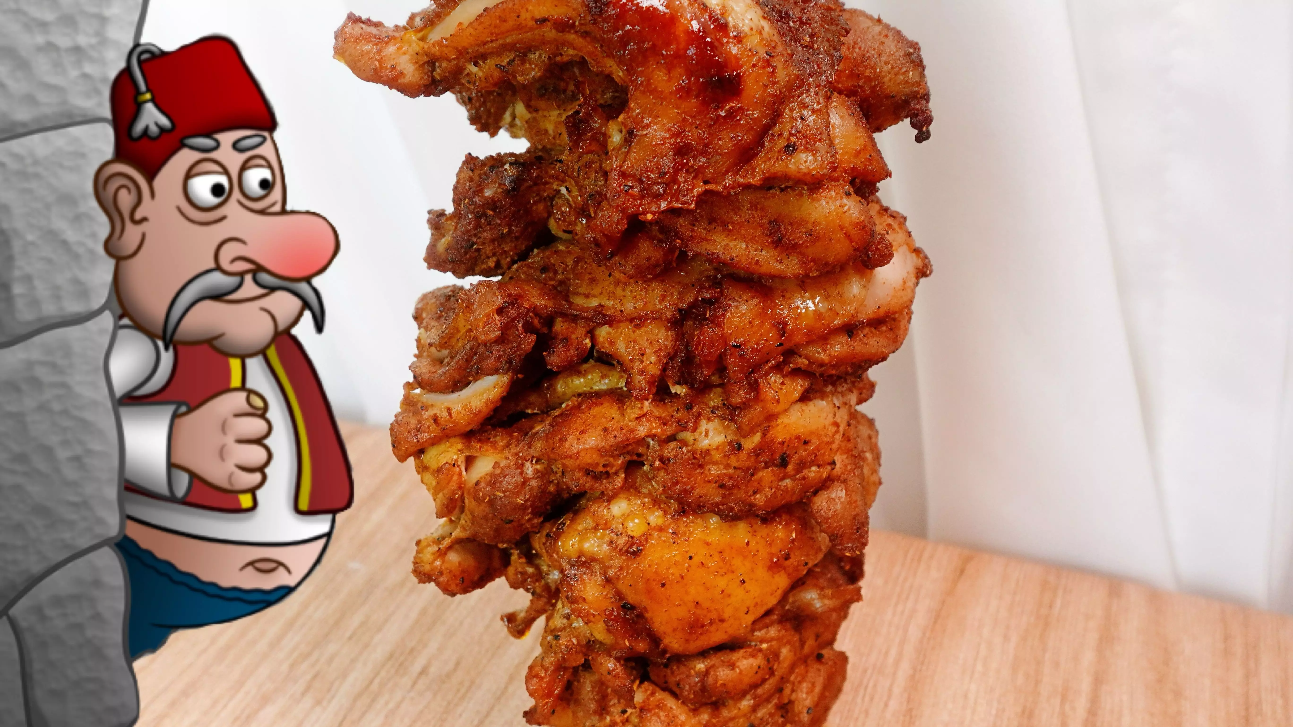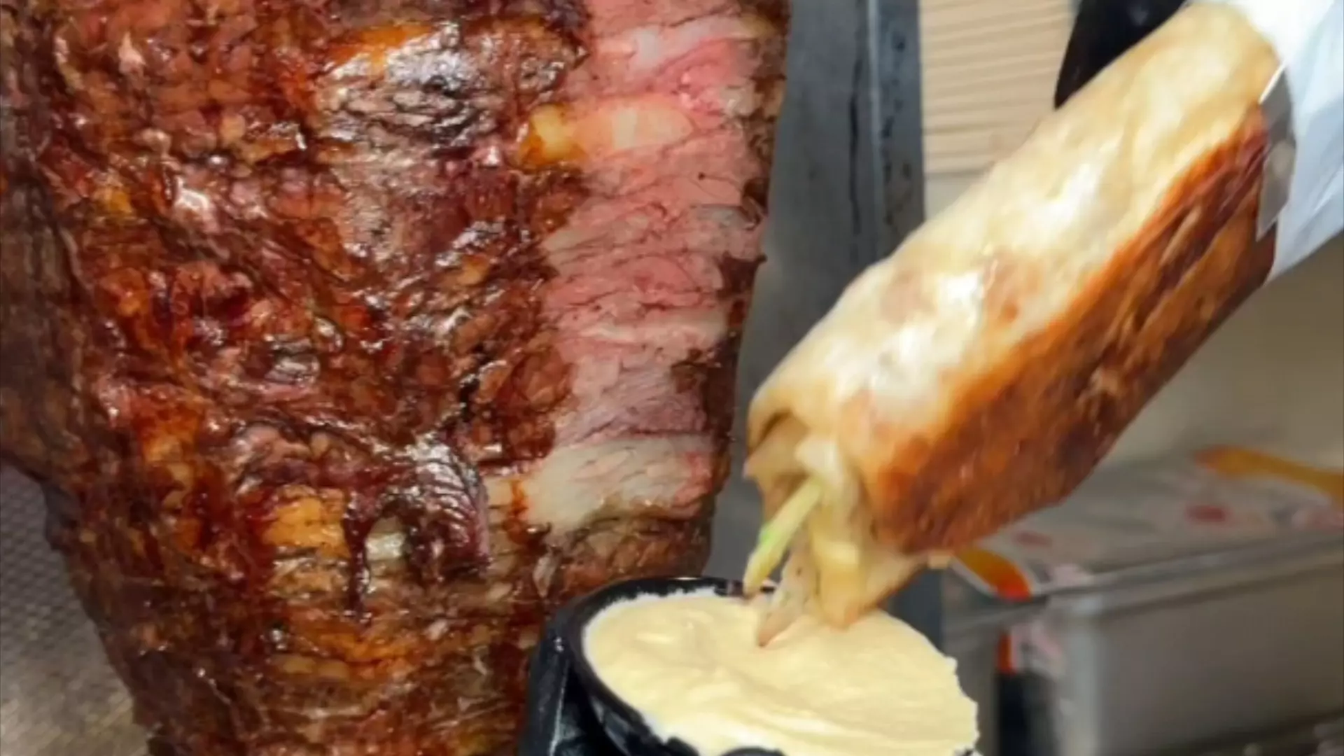 这是一则美食视频,展示了现实版沙威玛的制作过程,从处理大量生肉,到将肉堆叠成型,再到烤制完成,还原了沙威玛的制作工序,呈现出颇具规模的沙威玛制作现场。