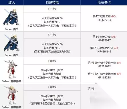 这里提供几个伤害参照:5宝满级2姐一发宝具10W左右伤害,绿叉触发特攻一发宝具也有5-6W伤害。黑狗宝具3红EX10W左右伤害。 (这里图中没有写明,第一个80%减伤的高文,只需要打到27W左右的血量即可通关) 莫德雷德 莫德雷德建议使用带消气或者晕眩之类的技能的英灵。或者带战斗服控制一回合,直接强行秒杀也可以,毕竟只有20多万的血量。 崔斯坦 崔悲伤的难点在输出很高,第2、3次血量也有些厚,就单体剑阶正常打即可,感觉崔斯坦就像于WOW里面那种硬件检测的BOSS。没有什么投机取巧,特别针对的英灵。