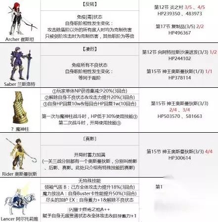 兰斯洛特 可以理解成一个24W、37W血的ruler职介,没什么好说的,推荐狂坦队伍,难度相对较低的一个BOSS。 魔神柱 注意两次回血,有条件第一次可以在10W左右的时候考虑积攒一波超高的爆发直接秒杀,第二次则是不要在开场爆发。(图中也没有注明魔神柱是被骑杀术狂克制) 拉二 开场直接上一个乔老师硬吃一发宝具即可。难度不大。 狮子王 唯一的难度就是血量,但是实际上血量比高文还要低,还有就是需要注意狮子王的宝具任何闪避、无敌都是无效的,需要用加防的技能硬吃。也算是所有难点关卡中比较简单的一个。(难度可能在目前游戏中强力的单体剑阶并不普及吧,罗摩、剑兰都是很好的可选从者。)