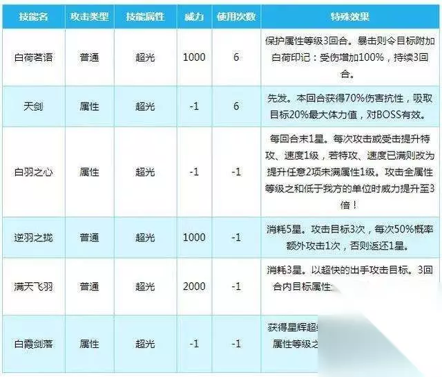 主要技能:白羽之心(被动),白荷茗语(小技能) ,逆羽之拢(必杀) 被动—白羽之心,受伤攻击提属(应该是提升攻击和速度,表里有错误),加伤 小技能—白荷茗语,保护属性,挂易伤 必杀—逆羽之拢,高伤害,概率回复星,只要运气好,必杀连着放 天赋星灵装备: 天赋基本就是天下无双,当然有资源可以提到唯我独尊(差不多要15个天赋道具),装备方面,白羽不吃专属,一套基础的钻装,不用升星就可以打出不俗的伤害,但星灵一定要挂仙王,仙王一套的暴击和暴伤真的很香