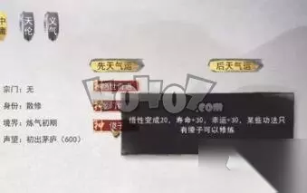 2.龙门锦鲤 这个先天气运的介绍是在鲤鱼跃龙门的时候就是玩家修炼成人的时候,这个气运可以让玩家们逢凶化吉,由于玩家天生长得很俊美,非常的出色,被一个仙家宗门看出了玩家的真身,想要夺得玩家的真身来炼化成金丹。 这个先天气运可以增加玩家们幸运属性四十点,魅力属性五十点,声望值五百点,防御力十点,正道五十点,开局随机被一个宗门追杀。 这个属性是只有修炼正道的玩家可以选择的,就是因为太亮眼了所以开局就会被追杀。 3.傻子 这个先天气运的介绍是傻人有傻福,悟性非常低,对很多人和事情看的都很淡,寿命很长,也非常的幸运。 这个先天气运可以让玩家悟性变为二十点,增加寿命三十点,幸运三十点,学习一些只有傻子才能学的功法。不过这个先天气运的缺点就在于学习功法太慢了,人家用几年就可以学会的功法,傻子得花几十年,可能还没学会就寿终正寝了。