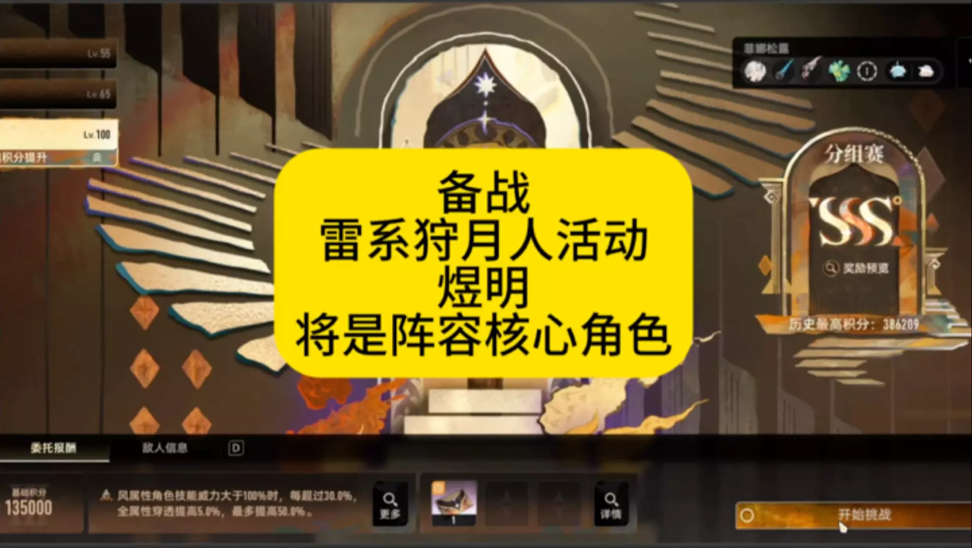 玩家分享在《鸣潮》狩月人活动中,难民级练度(41止流、21煜明、51扶疏,魔之楔基本+7)也有望拿到SSS评级,展示了煜明等角色及武器的属性配置。