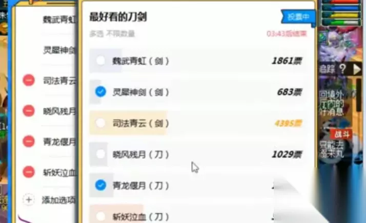 某知名主播拿120级刀剑来测试,看一看网友最喜欢哪个造型。120级刀剑武器都是有三个造型,剑分别是魏武青虹、灵犀神剑以及四法青云,刀的造型分别是晓风残月、青龙偃月以及斩妖泣血。而一万名玩家的投票结果如下: