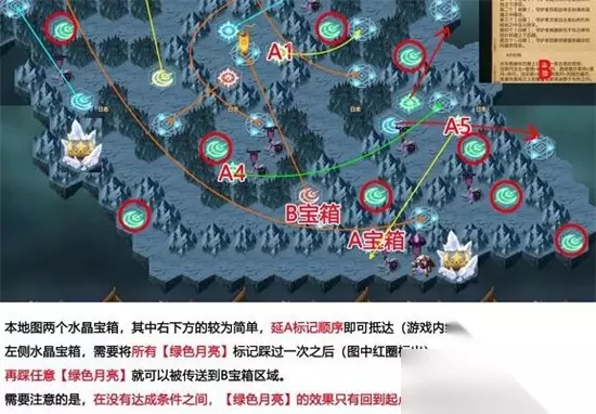 2、想要获得B宝箱需要玩家将地图中所有的绿色月亮标记都踩过依次之后,再踩任意一个绿色月亮标记即可传送到B宝箱的位置,如果玩家没有全部踩亮绿色月亮标记的话,踩已经亮起的绿色月亮标记会回到起点。
