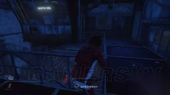 这两扇窗无论哪一扇打开,理论上都是可以溜屠夫的。为什么是理论上呢?因为相对来说上图右侧的那扇窗是打开的情况下比另一扇窗打开的情况要好溜一些,翻出左侧有遮挡物,可以看见屠夫走位而不被砍倒,右侧不远处也有一块板,可以应急用。相反如果是另一扇窗的话就没有那么高的容错率了,并且从外侧绕进因为是转弯之后需要立马翻窗,所以萌新很容易出现老年翻窗的情况……那就基本GG了。 更需要说明的是,这个点无论在哪扇窗溜屠夫,都需要小心屠夫套路上二楼,然后从二楼跳下直接给你天降正义~所以还是需要多多练习的。 如图这是二楼的视角,左右两个跳楼口对应的就是楼下两个窗户的位置。