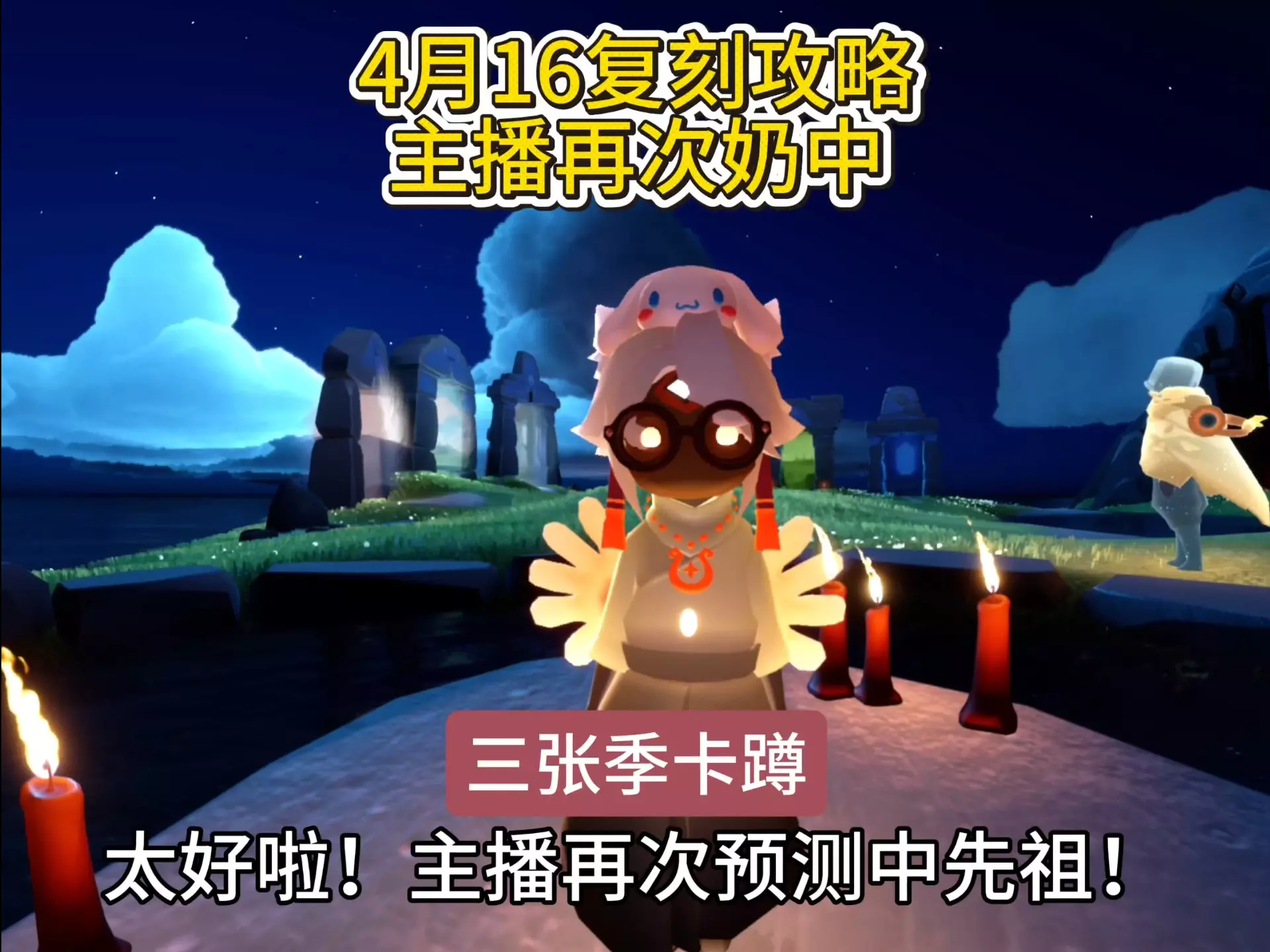 这是光遇4月16日复刻预测活动,曾多次预测命中的博主给出7位先祖的复刻预测,本次复刻处于集体复刻时间段,博主设置了预测福利:预测命中赠送3季卡,预测不中赠送2季卡,明天中午公布预测结果。