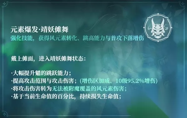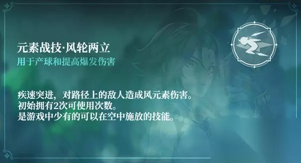 CD10s,命中时产生3颗风元素微粒,有0.5s的判定CD(靖妖傩舞状态下不产球); 遵循特殊的元素附着,即每0.1s至多附着一次,可以认为是无附着CD。
