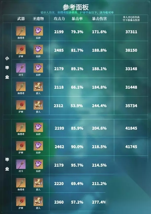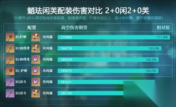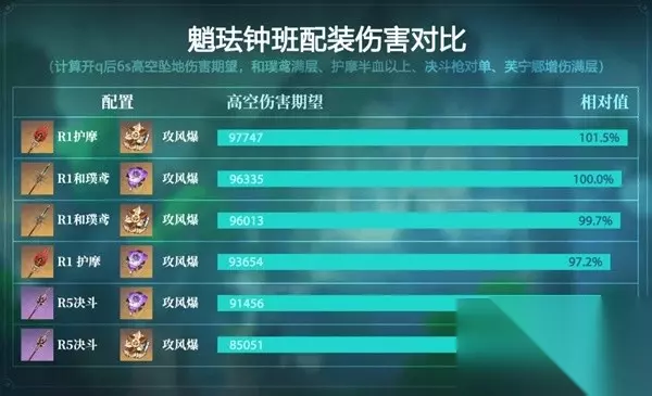 还可以选择各种攻击双爆类武器(如息灾、贯虹之槊、黑岩刺枪等) 魈输出依赖大招,对于零命魈:仅搭配6命珐露珊时,建议130%左右充能;搭配非6命珐露珊则需要砂糖/闲云协助充能,仍然建议130%左右充能;既没有6珐也没有砂糖闲云时,则可能换用充能沙也难以循环;如果既有6珐又有砂糖/闲云,则120%即可。魈有一命则可以降低10%左右充能。 以下是魈珐钟班、魈珐芙闲两种配队使用常见的武器圣遗物在满BUFF时的对单伤害期望对比: