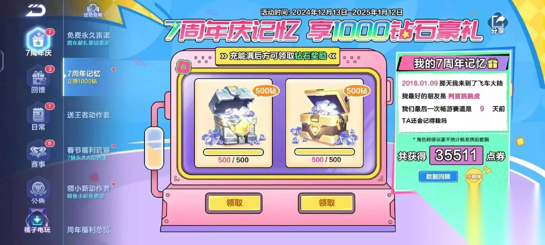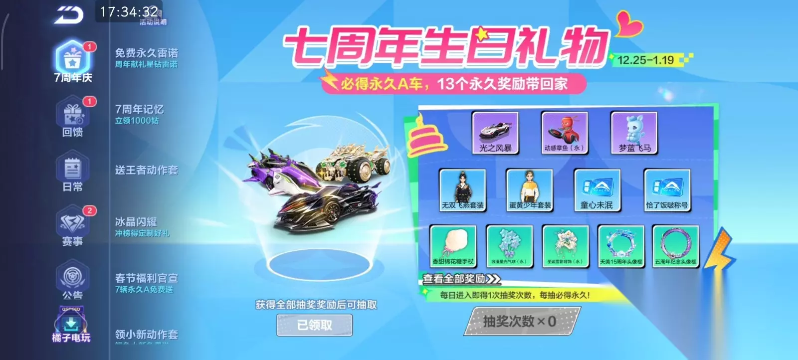 7周年的福利有a级赛车永久免费得,一个机甲蓝波豚宝宠物买免费获取,限时钻石商店优惠上新,还有超便宜的勋章可以抢购,全新的升级得好礼,新赛季和锦标赛开启,全新的成就系统上线等诸多福利优惠。在周年的活动期间会开放各种活动任务,玩家完成这些任务可以获得积分,积分累计到120时可以换一个鹦明神鹉的a级赛车,在活动的界面可以领取一个小冰魄的体检资格,在里面可以提前开上鹦明神鹉这辆a级车,不够有30天的体验时限,要想获得永久的车还得去完成任务。