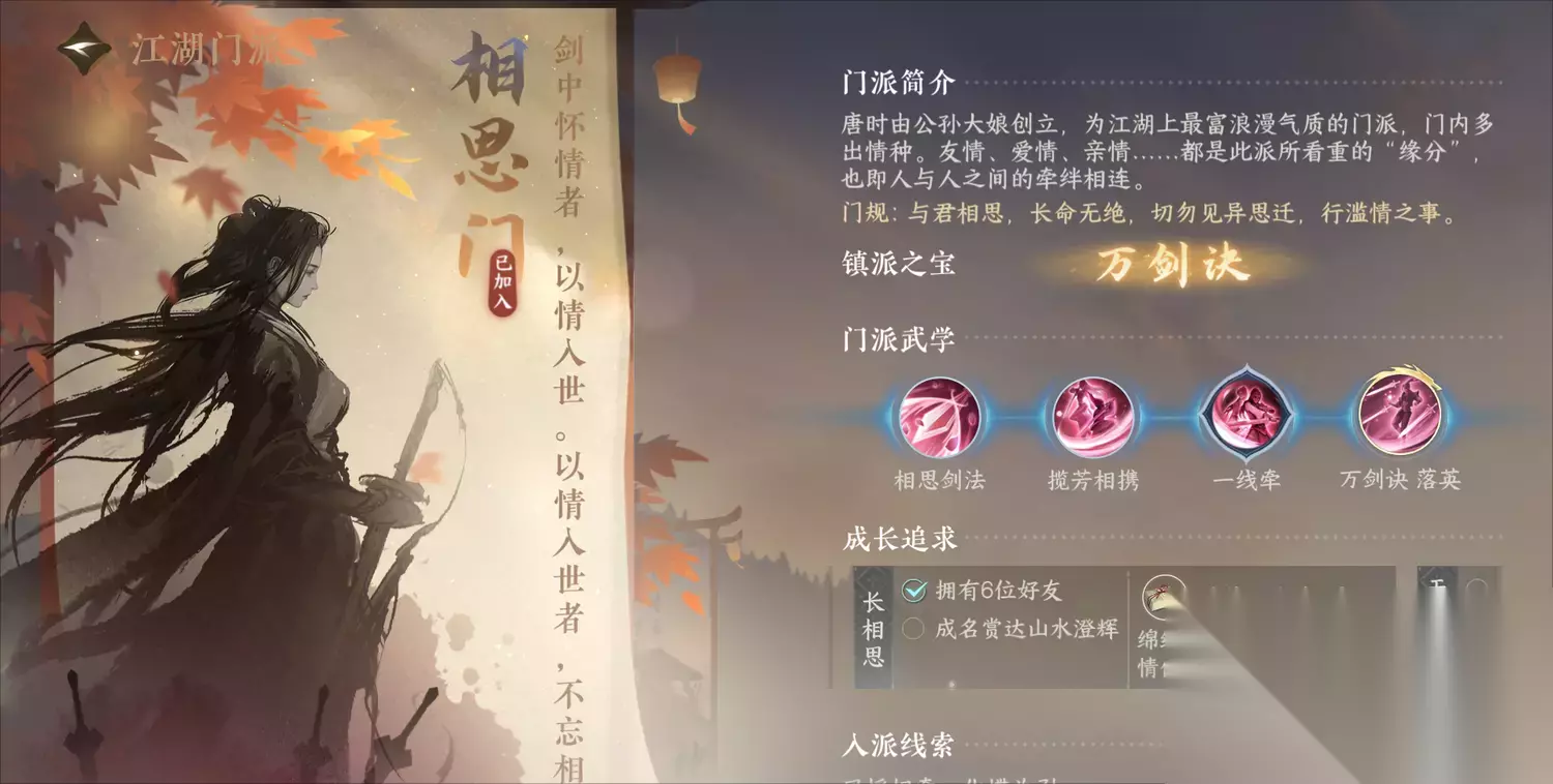 逆水寒手游中存在着许多江湖门派,相思门就是其中一个非常有名的门派,很多小伙伴因为相思门的衣服非常好看而加入了,今天小编带来相思门的门派加入方式和快速毕业的攻略,有需要的玩家一起来看看吧。