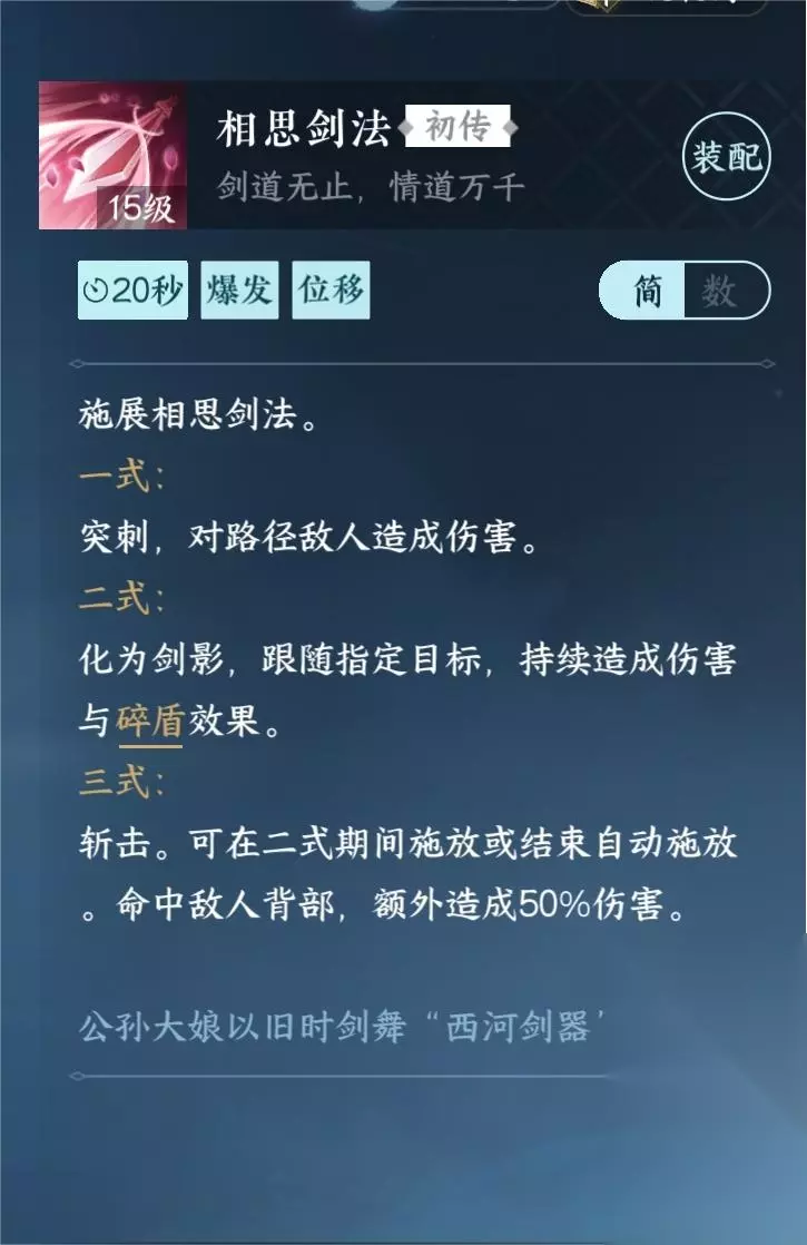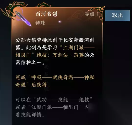 信物与技能获取方式: 【相思剑法】 入门技能进入就给