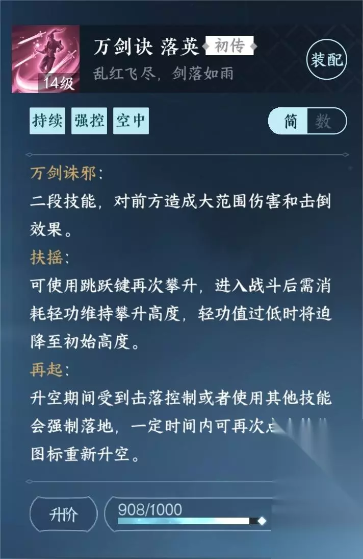 时装和技能一线牵需要成名赏和舞蹈身份6级才可以解锁。 【万剑诀落英】