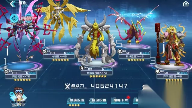 增幅卡片推荐:爆发 编队特色:骷髅猛犸兽X可为队友提供生存保护,为齐天悟空兽赋予磁化标记,使其对敌方造成高额伤害; 利维亚兽X可为队友提供多重光环与附加效果;光明兽X可对目标造成真实伤害,且可恢复队友AP;奥古杜兽X可削弱敌方属性,对敌造成猛烈打击。