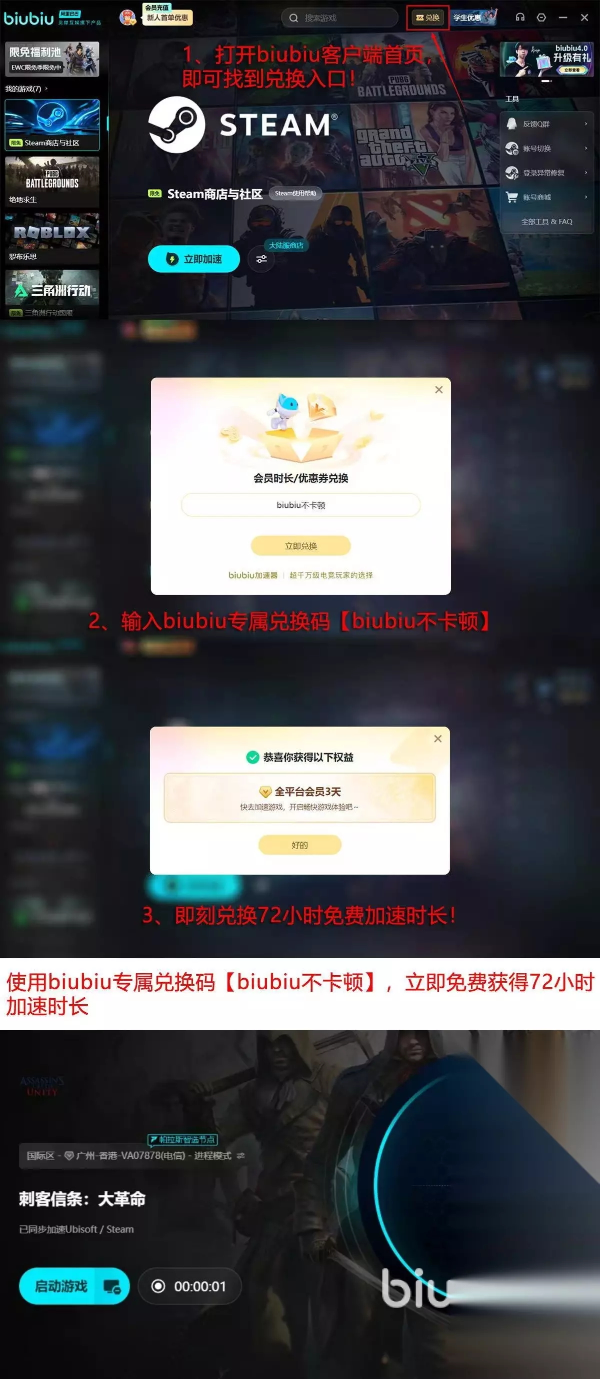 关于使用成本方面,大家也不用过于担心,现在新手首次注册会直接赠送24小时的免费加速,使用【biubiu不卡顿】这一兑换码,还能再额外获取到72个小时的免费加速,合在一起总共有96个小时,让大家能进一步延长畅玩时间。