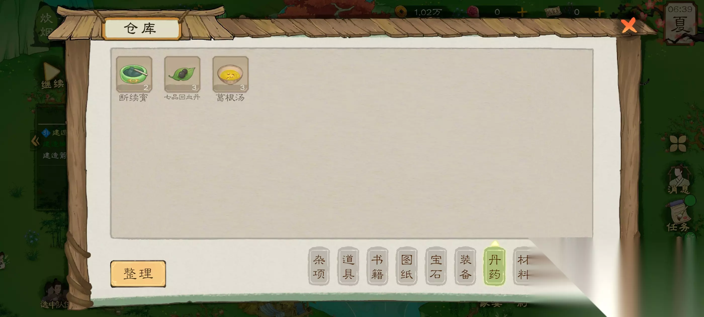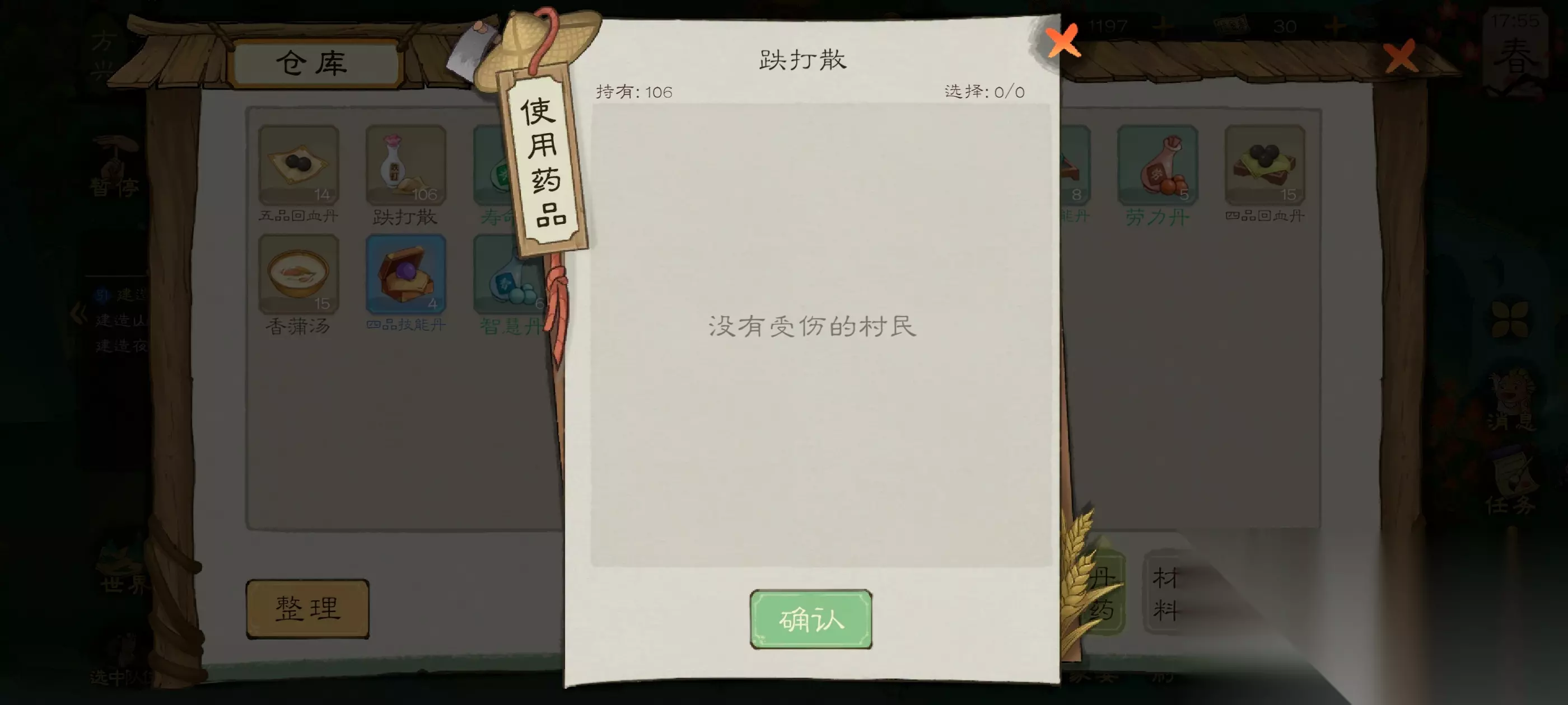做完之后打做完之后打开仓库,点击丹药,给受伤生病的人吃药,疾病条就会慢慢减少,直到归为零