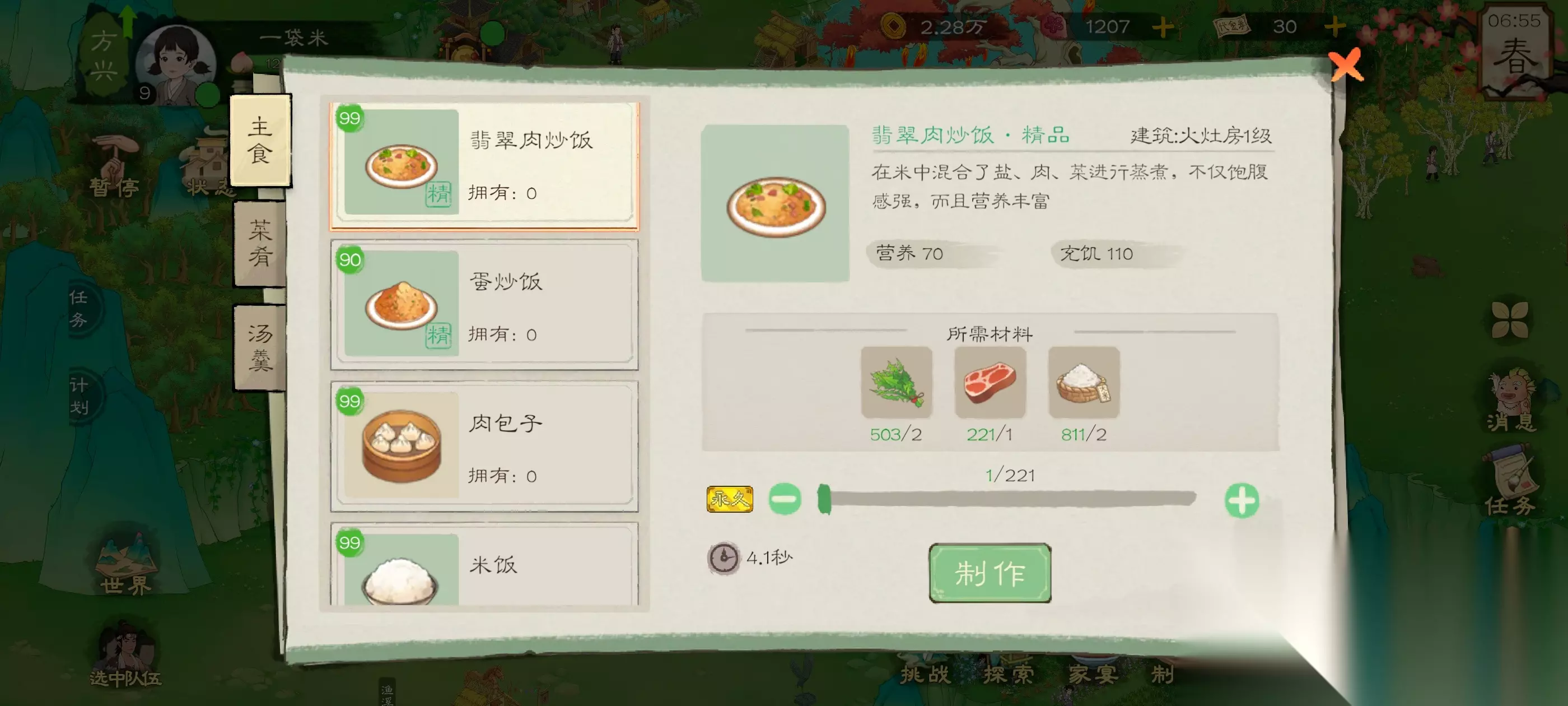 我们这里直接制作野菜面,野菜汤的话,太亏了,要的食物多,加成还少,具体价值大家可以看图,上面的营养与充饥 开局大致思路就这样,食物尽量选择野菜面,剩下的浆果什么的因为食物稀少直接放上家宴 然后等到自己种的成熟结出小麦就行了,拿小麦配合野菜制作野菜面,再加上一些浆果什么的前期食物基本解决