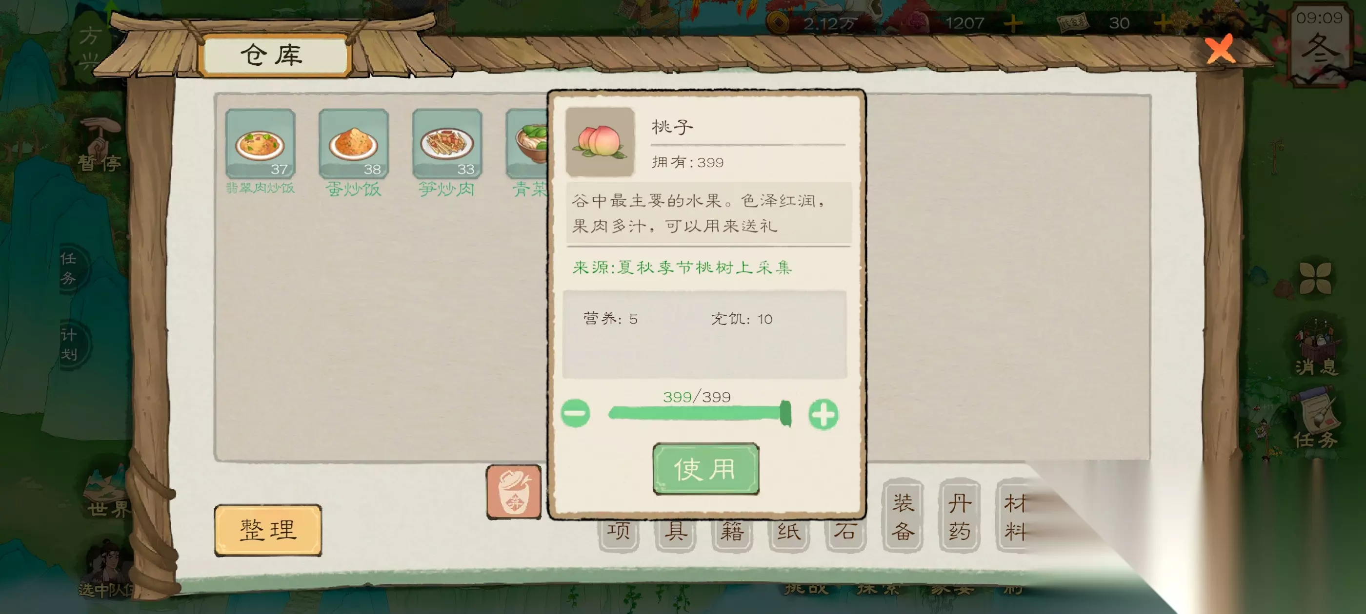 买完一批之后直接进行刷新继续买桃子直到把免费刷新全部用完为止 这时我们就拥有了400个桃子,这桃子可以直接吃的,我们打开仓库,点击使用食物食用桃子,直接拉满,把桃子全吃了,当然,你也可以省着吃,把桃子放上家宴啥的