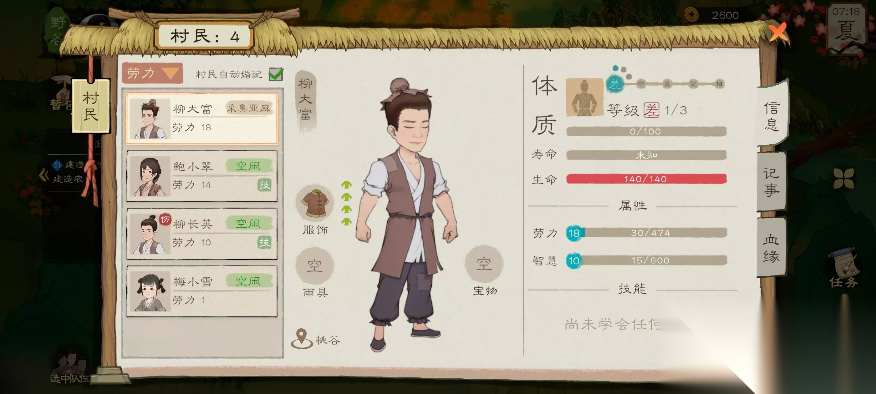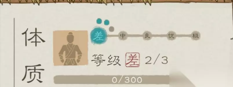 体质分为差中良优极,体质差的就更容易生病,感染的也更严重,像我上张图片是个小孩,所以体质差是正常的,如果体质高的话,就不容易生病,而且干活也会更快 如何提升体质呢? 干活,吃饭,喂丹药啥的,慢慢积累下方的经验条,满了之后就会提一个等级,你吃的越好,你体质经验就越多,寿命经验也会越多,寿命越长,相当于体质就越高,因为有时间来提升嘛