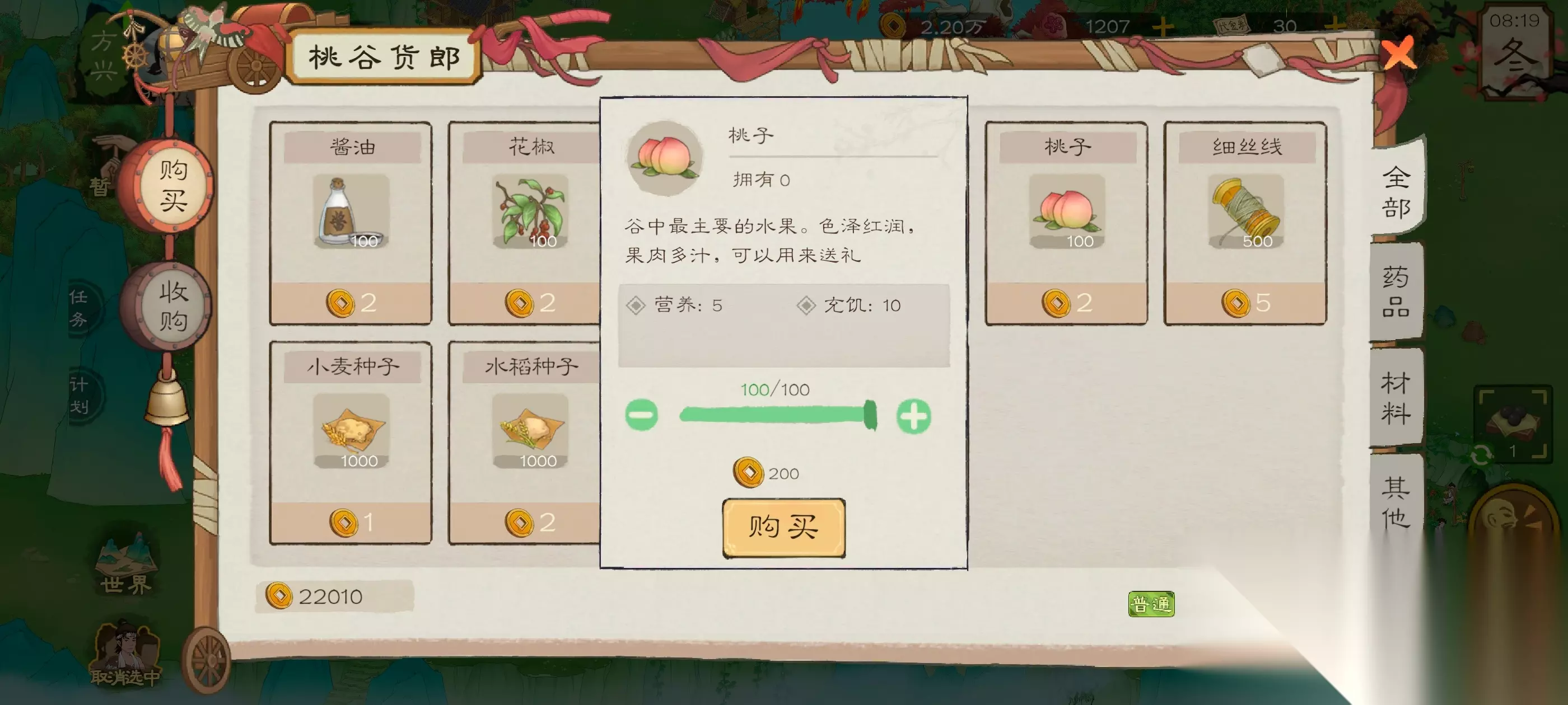 我们点开商人寻找桃子,这个别不舍得,反正只是要铜币罢了,全部买完