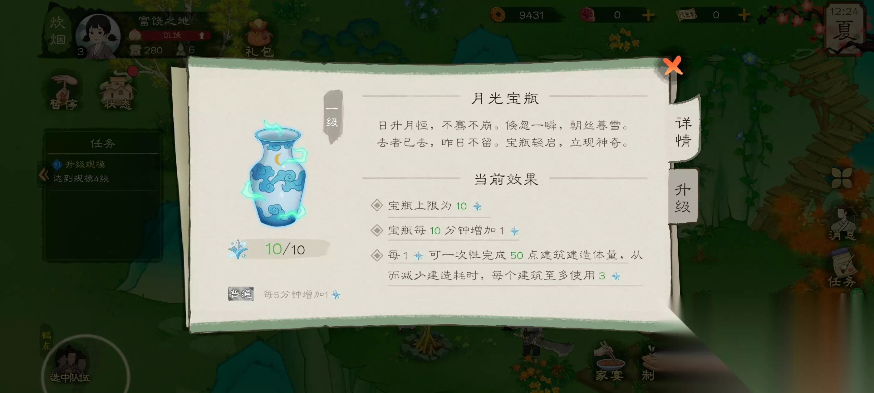 这个是有大用的,他每十分钟会弹下一滴月光水,最多存十滴,月光水能用来缩减建造时间