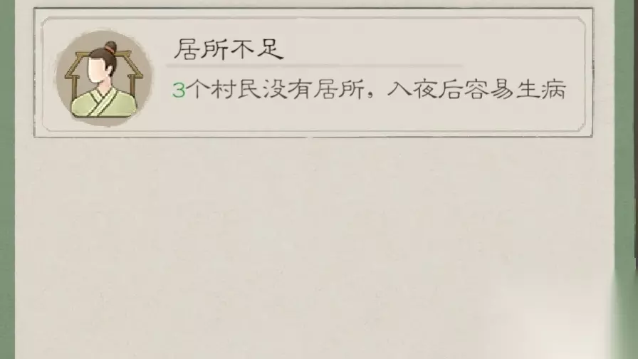 只要村民生病就会上负面buff,我轻疾就是劳力降低10%,就是干活效率更低,同理如果不管的话负面buff也会更多,更加严重直到死亡 困难模式下,你生病治疗好像是会减少村民寿命 这些病是怎么来的? 桃园2是有季节环境机制的所谓春夏秋冬,大风雨雪,比如说你冬天就更容易感冒,夏天更容易中暑啥的,在不同的季节环境下,生的病也不同,病情程度也不同,有就是没地方住,在夜晚的时候会着凉,这个时候我们就需要建造更多的房子