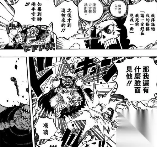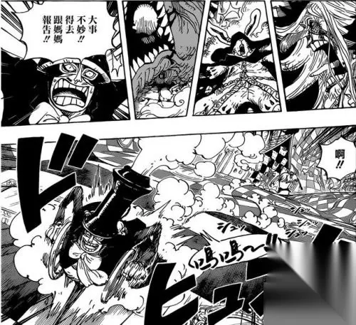 海贼王漫画849话 【宝物之间】 从打倒的敌人身上拿到钥匙的布鲁克 布鲁克:这就是钥匙了吧! 后面传来了别的士兵的声音:这个混蛋!!还真是闹得够厉害的!! 布鲁克:“飞燕曲(swallow)bandorou(这是燕尾斩以前的那个名字)” 解决掉士兵的布鲁克:那是当然了…… “佩德罗先生,能请你做诱饵么?” 布鲁克:我啊,可是拜托搭档去“见一下死亡”了啊 布鲁克:都已经到了这个地步了,再得不到想要的东西的话,那真是太丢脸了! 收拾掉最后一个人的布鲁克 布鲁克:你说谁没有可以丢的“脸”啊——!要抓紧了! 用钥匙打开宝物库的布鲁克 另一方,门外面的斯慕吉 斯慕吉:诶?妈妈 士兵:女王大人! 斯慕吉:不用特意过来也行啦,这里有我…… bigmom:让开点斯慕吉! 一击就把墙壁直接打穿的bigmom bigmom:是谁啊?插手我的“乐趣”的人!! 布鲁克:??——诶…………难道是………… bigmom:哦呀?这还真是珍奇的生物呢? 布鲁克:“bigmom”…………