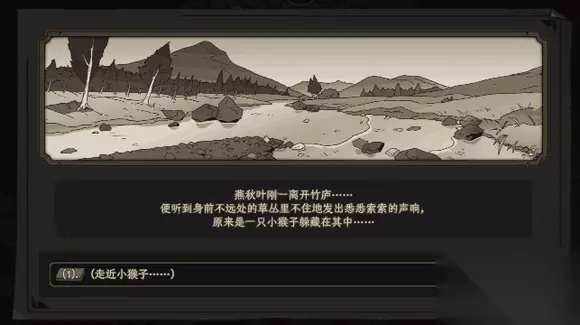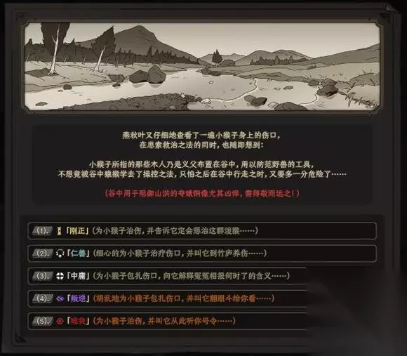 小猴子因为谷中的猴群打架而负伤,向你求救。在这个界面,你会第一次面对【立场选项】: