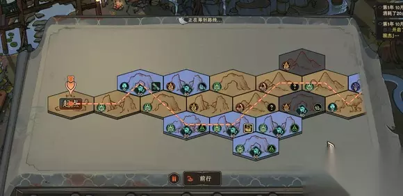 系统会自动给你规划一条路线,想要避开哪个地块,可以单击要改的地块,选择赋元,地图上带有“?”的地块,一般是会发生战斗的地块。单击前行或单击空格键,可以开始奇遇,注意奇遇开始后无法更改路线。 触发战斗后,界面如下: