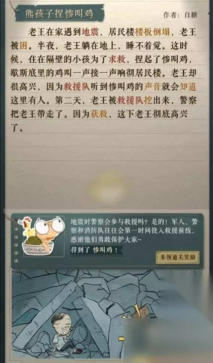 海龟蘑菇汤熊孩子捏惨叫鸡过关攻略分享 老王在家遇到地震,居民楼楼板倒塌,老王被困。半夜,老王躺在地上,睡不着觉。这时候,住在隔壁的小孩为了求救,捏起了惨叫鸡,歇斯底里的鸡叫一声接一声响彻居民楼。 老王却很高兴,因为救援队听到惨叫鸡的声音就会知道这里有人。 第二天,老王被救援队挖出来,警察把老王带走了。因为获救,这下老王彻底高兴了。