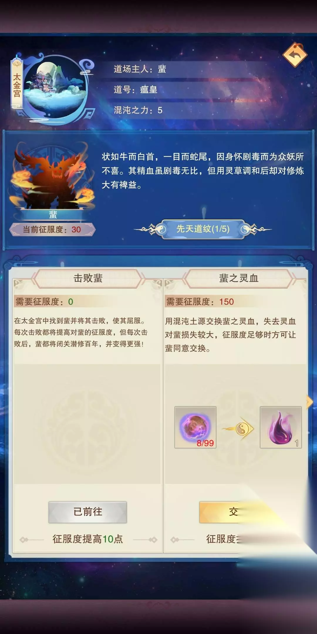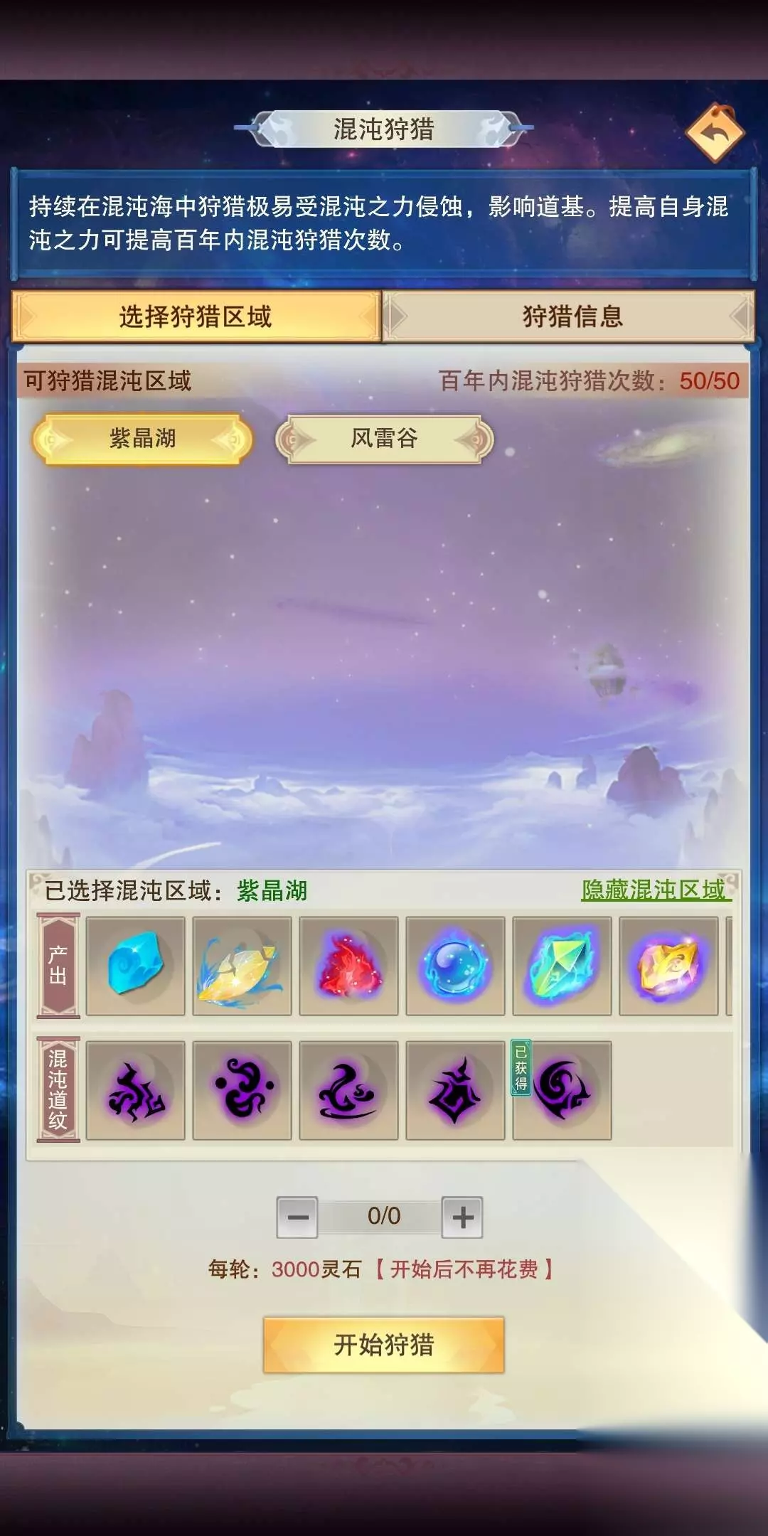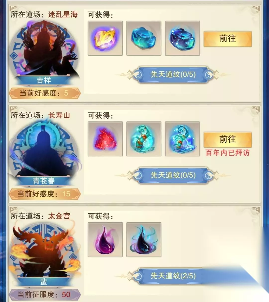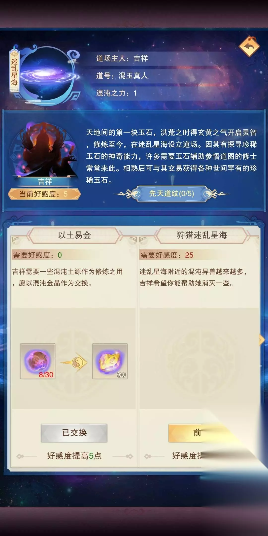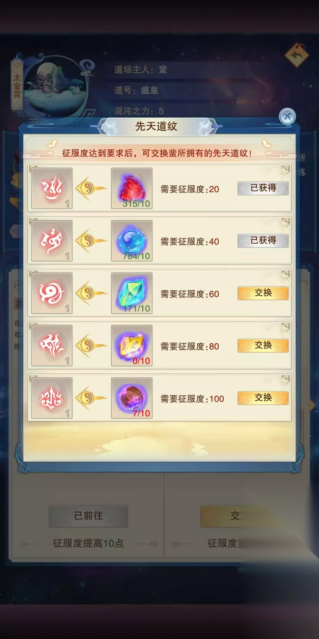 1精粹加1点攻击,1灵粹加1点防御,1元粹加10点生命每个区域的混沌五行材料产出不同,如紫晶湖混沌火元较多,风雷谷混沌水精较多。狩猎一定次数可获得混沌道纹,集齐五个道纹可花费100玄黄之气推衍道图混沌生灵达到100好感度/征服度可以用混沌五行材料兑换一套先天道纹,如图(好感度也是一样)