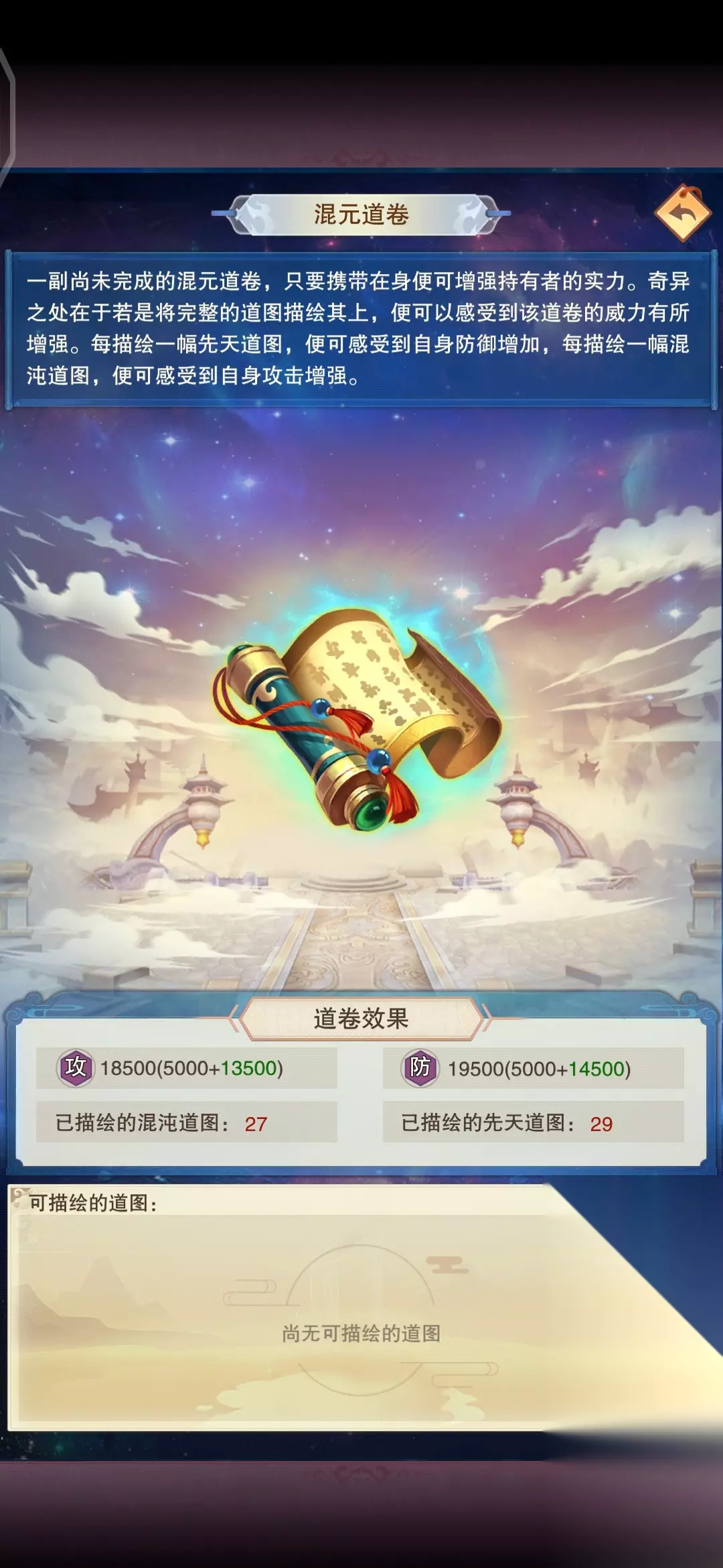 混元道卷:根据获得的先天道图和混沌道图增加属性,需要手动点一下描绘道图,初始增加攻击防御各5000,每描绘一个先天道图增加500防御,每描绘一个混沌道图增加500攻击
