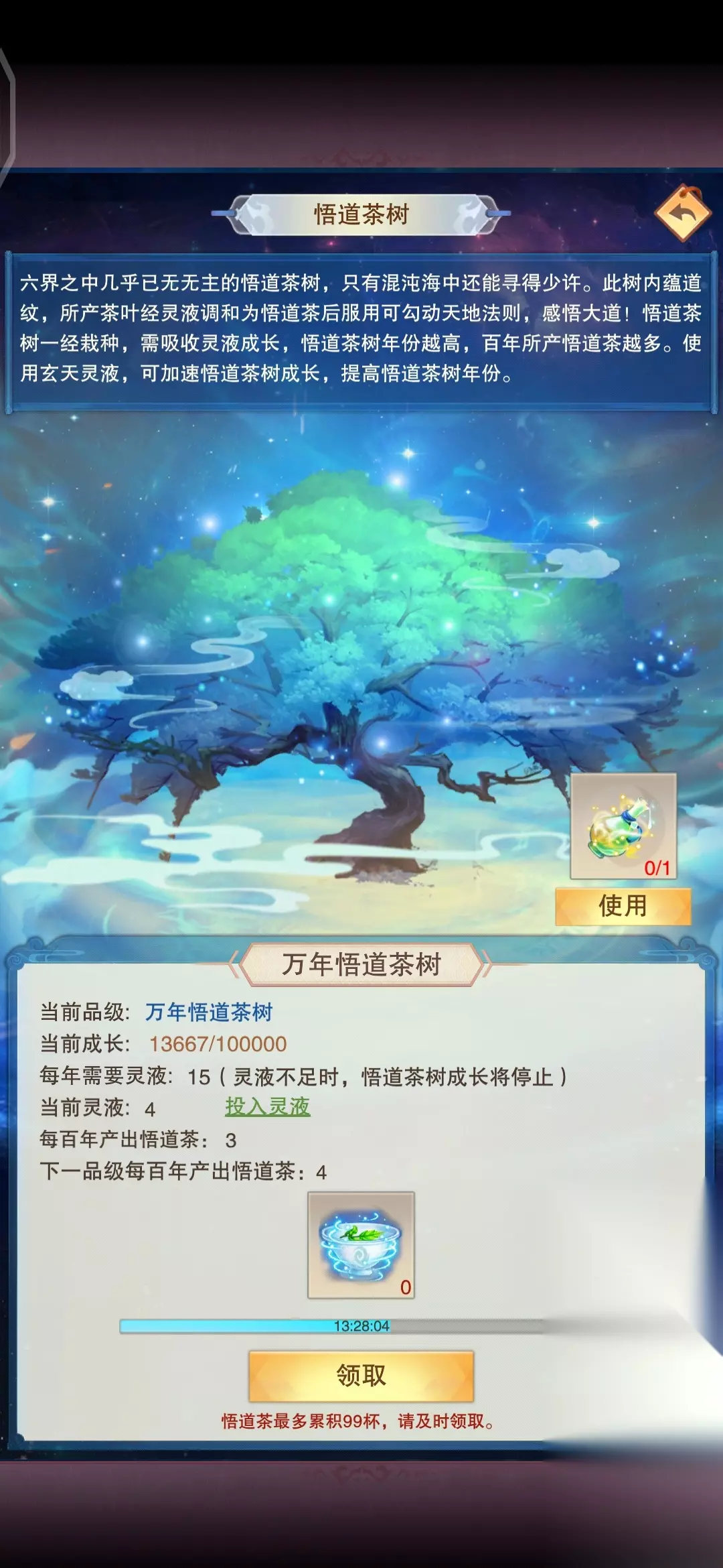 悟道茶树:开启后每天可以领取悟道茶,当天未领取会累计到第二天初始为百年悟道茶树(每天一杯茶),投入灵液后,每天会自动成长,灵液不足停止成长,成长值达到上限就会升级,购买玄天灵液可直接增加10000成长(可直接升级为万年悟道茶树),购买需要100上灵