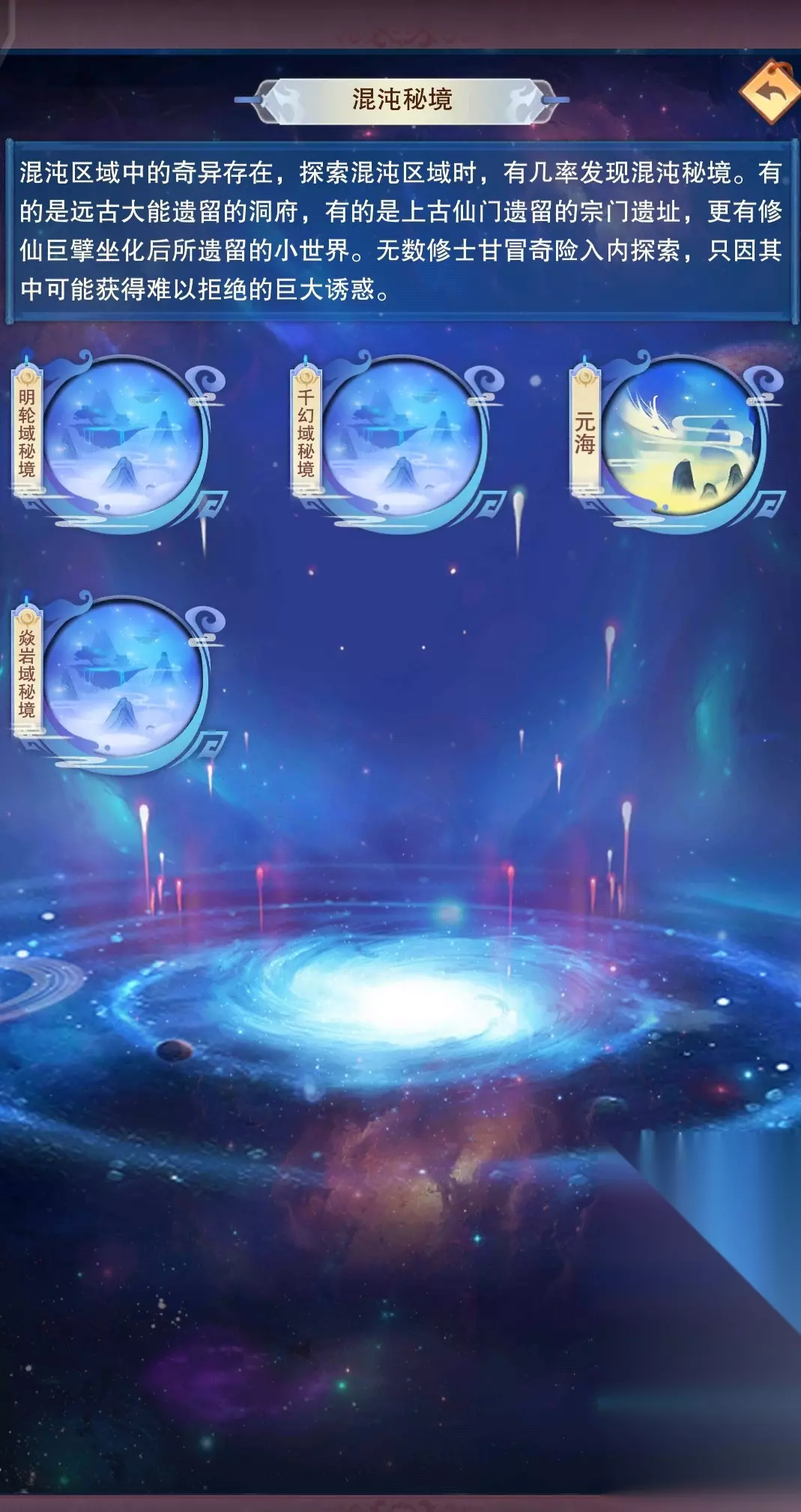 混沌秘境目前有六个秘境,分别是明轮域秘境(悟道茶树)、千幻域秘境(混元道卷)、元海、焱岩域秘境(须弥鼎)、罗天域秘境(玉髓石)、青霜域秘境(空行舟)探索完后可获得混沌奇珍,且除了元海之外每天可探索一次(相当于大能遗府),元海是灵石换神识碎片的,相当于血浮屠,元海有四个区域,刷第一个最划算,后面的不用管这些秘境对应的地图在哪可以自行去仙侠营地查看明轮域秘境-明轮域,千幻域秘境-千幻域,元海-广寒域,焱岩域秘境-焱岩域,罗天域秘境-罗天域,青霜域秘境-青霜域