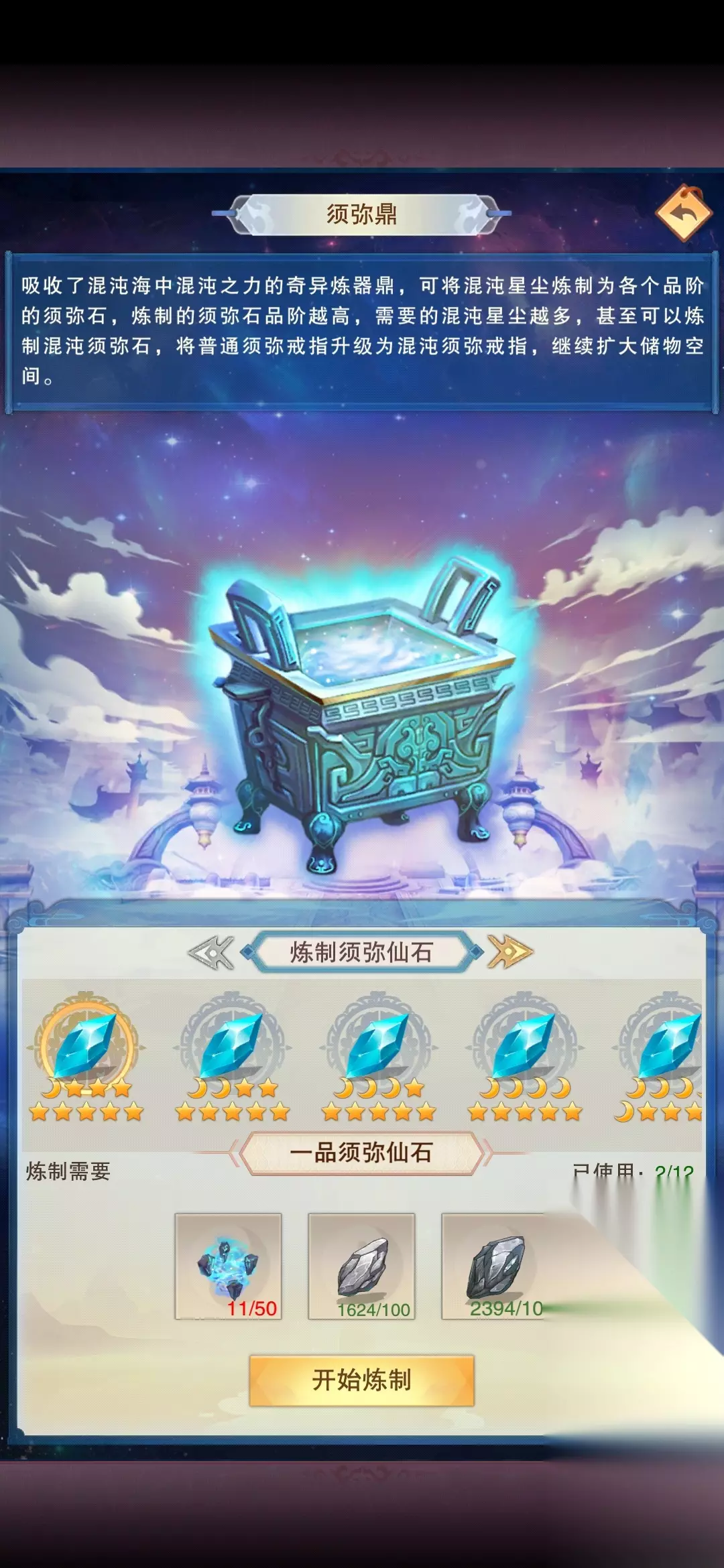 须弥鼎:可炼制仙品以上须弥石,无论炼制哪种须弥石都需要混沌星尘和月冥石,只有最后一个需要的不一样,仙品须弥石需要万年铁精,神品和混沌须弥石需要神界的石头,一品为神一的石头,二品需要神二的石头,以此类推混沌星尘通过探索焱岩域秘境获得